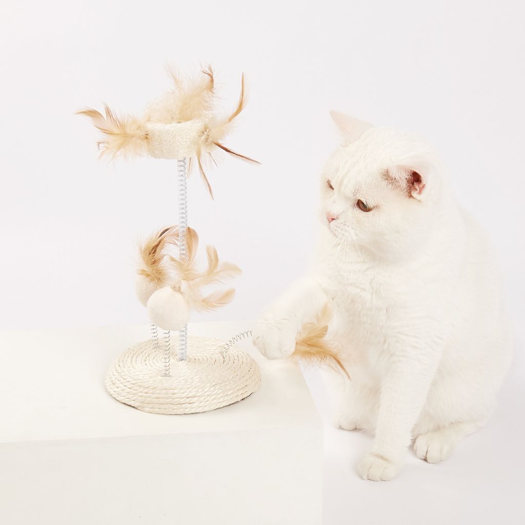 - Chất liệu: Lông vũ tự nhiên, bàn cào được quấn bởi dây thừng sisal an toàn và thân thiện với thú cung