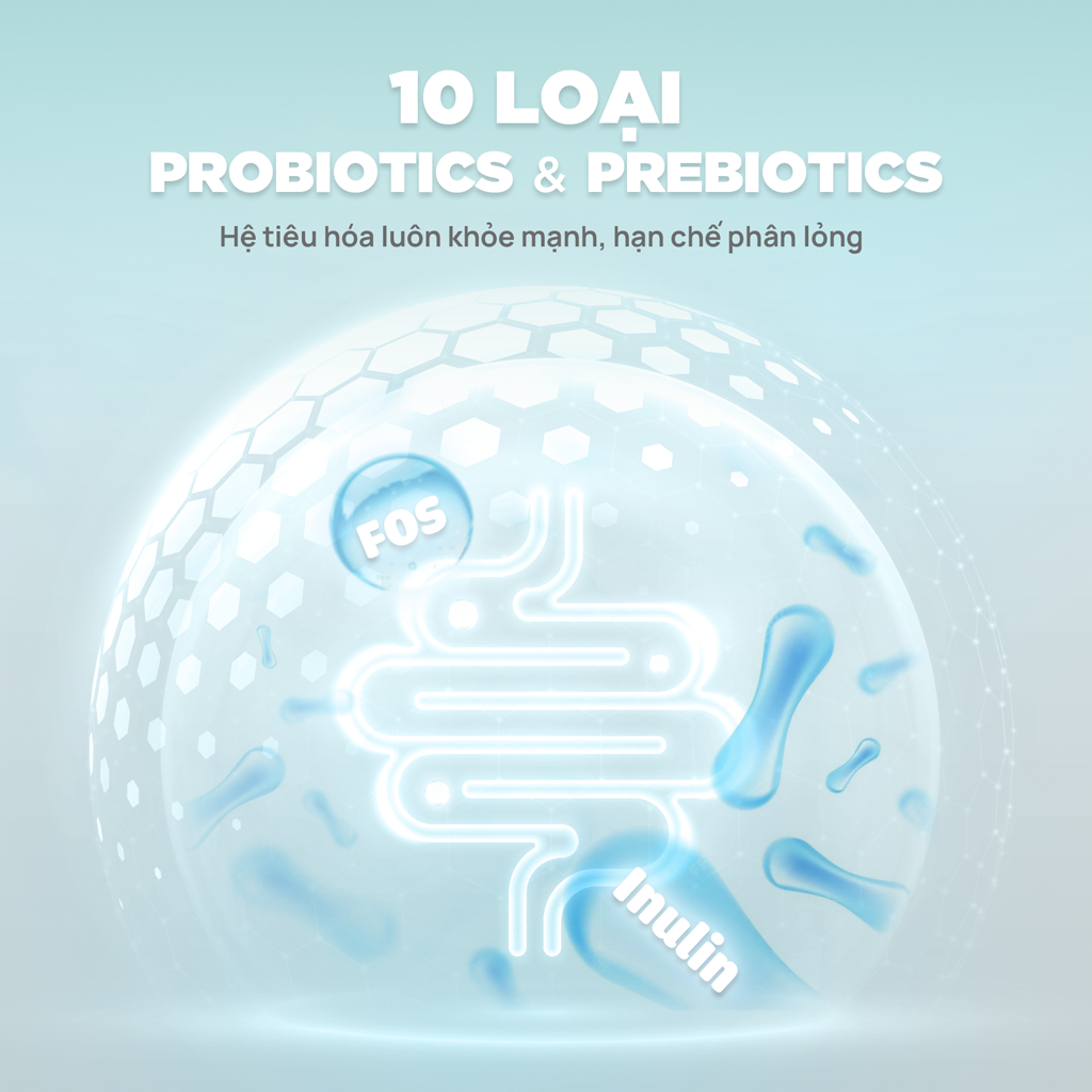 + Tiêu hóa: Với 10 10 loại probiotics & prebiotics giúp hệ tiêu hóa luôn khỏe mạnh, hạn chế tình trạng phân lỏng