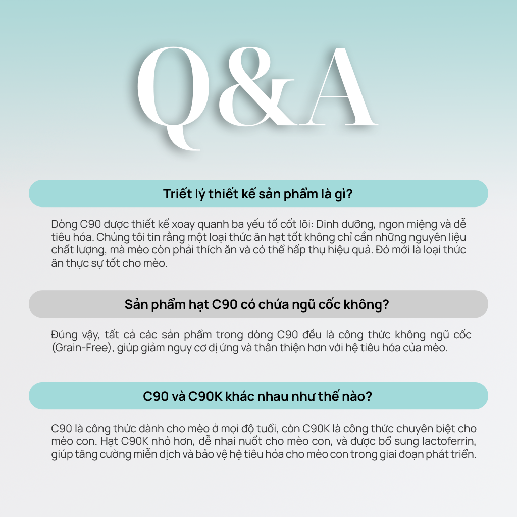 - PetQ sản xuất ra dòng sản phẩm thức ăn hạt Churro C90 với 3 tiêu chí: Đầu tiên, dinh dưỡng là nguyên tắc cốt lõi. Thứ hai là cảm giác ngon miệng khi mèo ăn. Cuối cùng là bé phải thật sự hấp thu và tiêu hóa tốt các chất có trong hạt. Thành phần sản phẩm chủ yếu là từ 90% thịt và dầu động vật, đảm bảo dinh dưỡng với hơn 40% protein dễ hấp thu. Cấu trúc hạt hoàn toàn mới với công nghệ "Churro", nhân thịt thượng hạng tạo nên mùi thơm và hương vị khó cưỡng. Ngoài ra, thành phần hạt còn có 10 loại probiotics & prebiotics giúp hệ tiêu hóa luôn khỏe mạnh, hạn chế tình trạng phân lỏng. Chất lượng như vậy, Sen ngại gì mà không cho bé ăn thử nè!